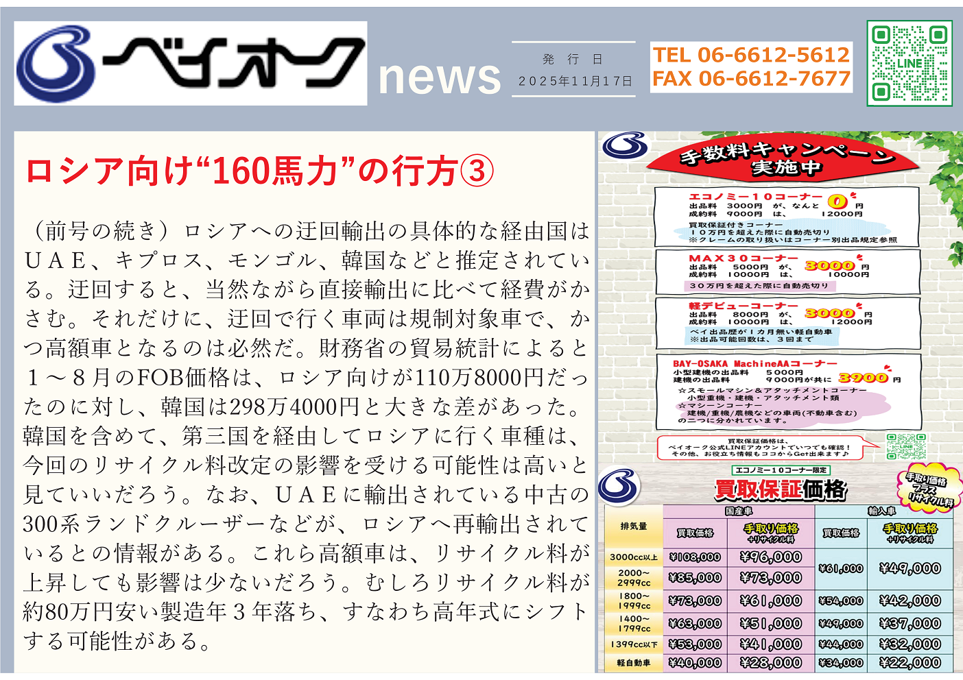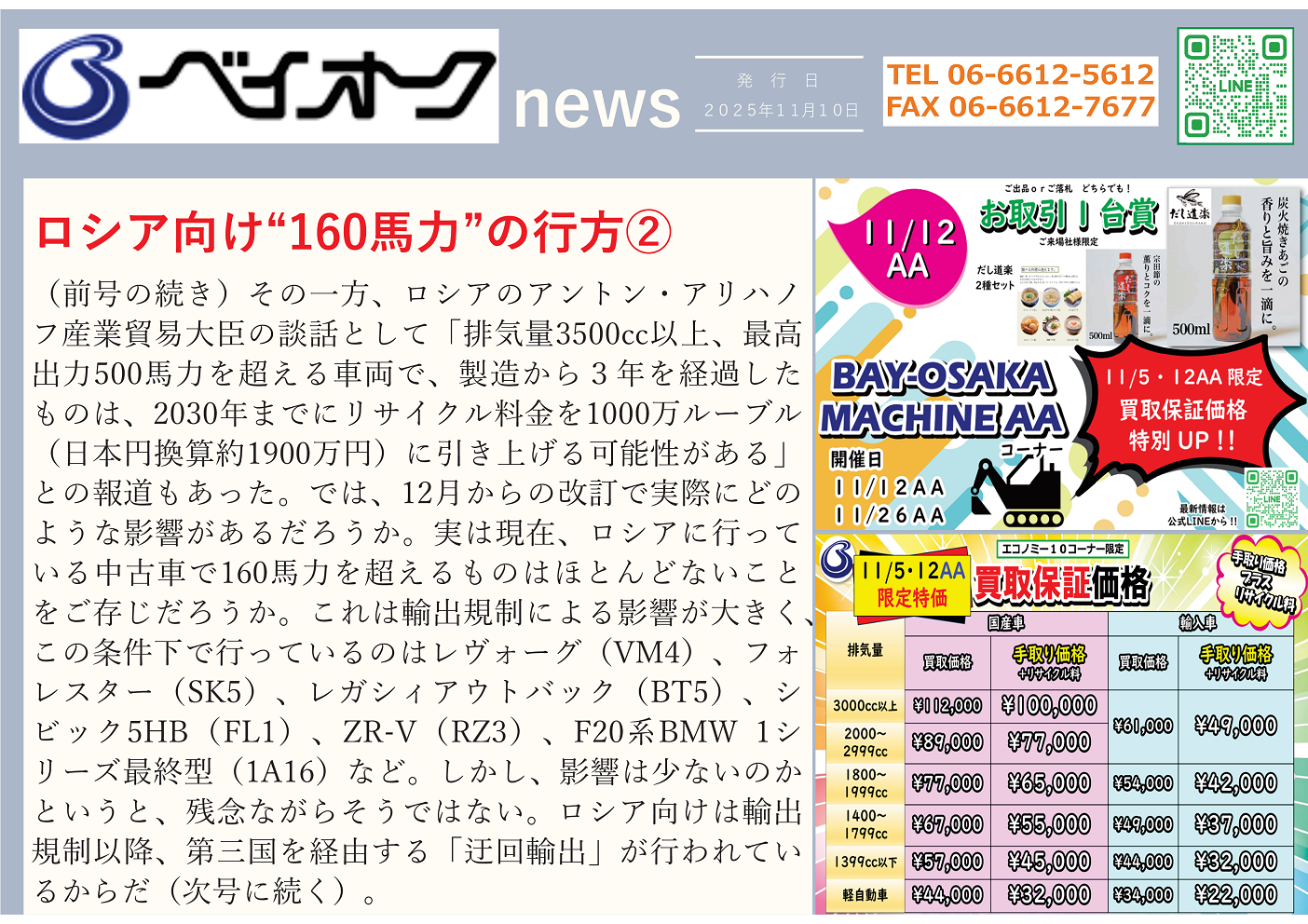 2025.11.5 第2329回通常AA 2025.11.12 第2330回通常AA 2025.11.19 第2331回通常AA 2025.11.26 第2332回通常AA 11月イベントのご案内 弊社提供データに関するご案内 お客様駐車場について 11月19日AA 配置図及び搬出可能時間 買取保証価格のご案内 建機・重機用限定会員のご案内 クレーム延長サービス開始のご案内 後見・下見サービス開始のご案内 実施中のキャンペーンのご案内 ベイオークLINE公式アカウント 友だち募集中 オフィスや自宅からインターネット回線を通じてセリに参加できるのがベイネットです。 下見検索や不在入札機能、自社出品車輌の確認など豊富で使いやすい機能がいっぱいです。 2025.11.17 ベイオークnews 2025.11.10 ベイオークnews 2025.11.3 ベイオークnews 2025.10.25 ベイオークnews 2025.10.21 ベイオークnews 2025.10.11 ベイオークnews 2025.10.6 ベイオークnews 2025.9.26 ベイオークnews 2025.11.11 秋の大感謝祭りAAは出品、成約とも今期3番目(goonet 10/21) 2025.11.11 【この道のプロ】Vol.008 ホンダ泉州販売(大阪府和泉市)㊤(goonet 9/30) 2025.10.21 新鮮な良質車揃え仕入れ後押し出品1850台で秋の大感謝祭り(ユーストカー 10/21) 2025.09.02 遠方対象にクレーム期間を延長無料の事故確認や後見サービスも(ユーストカー 9/2) 2025.09.02 建機・重機・農機などを対象とした新コーナー開設(goonet 7/23)