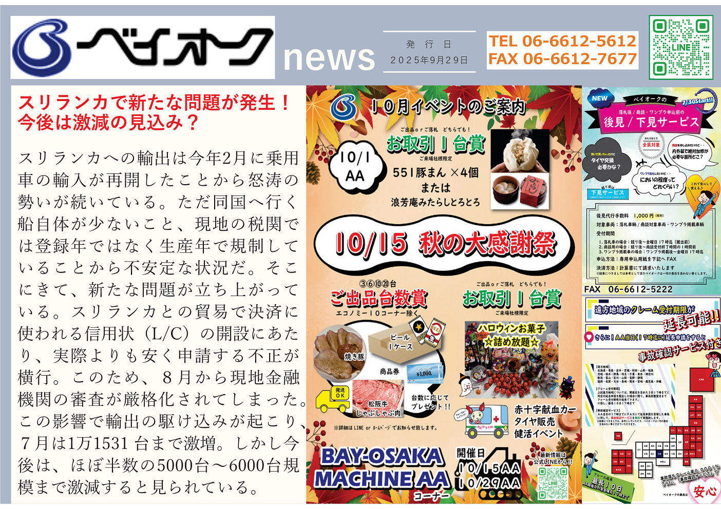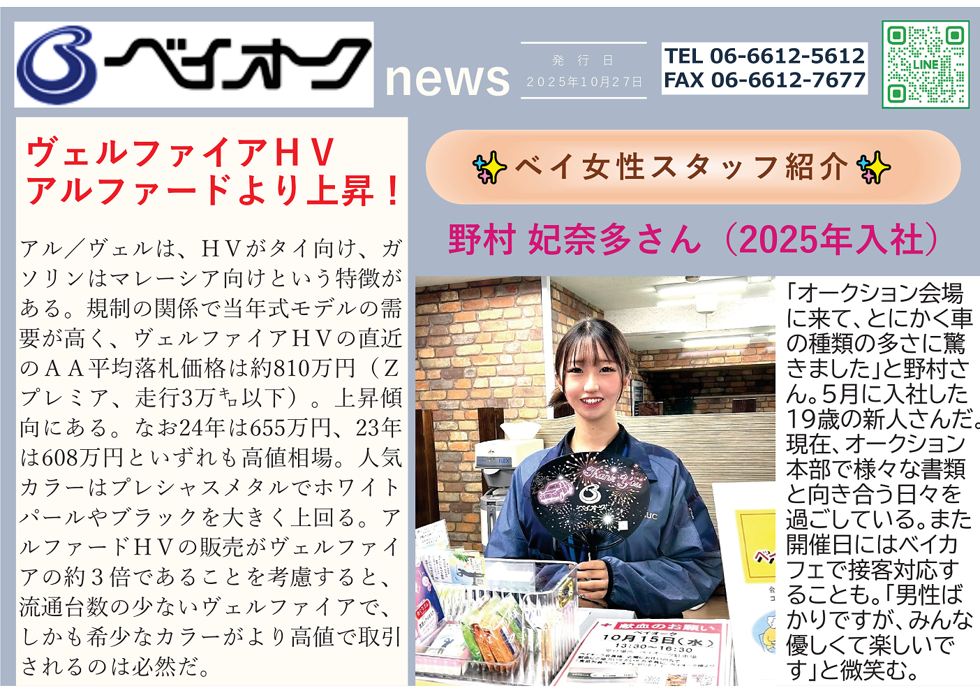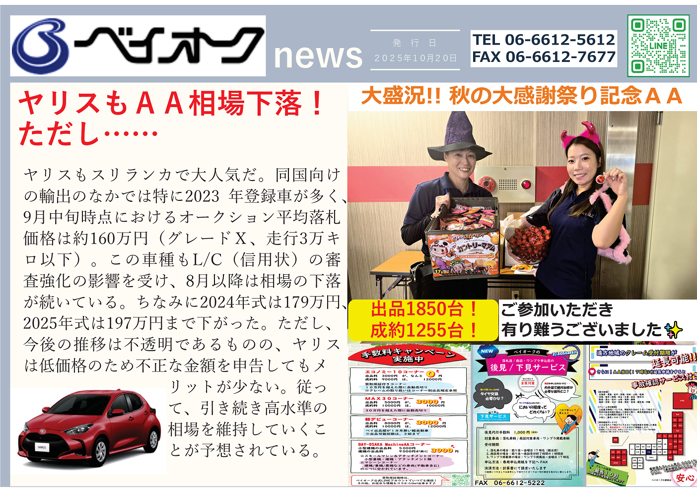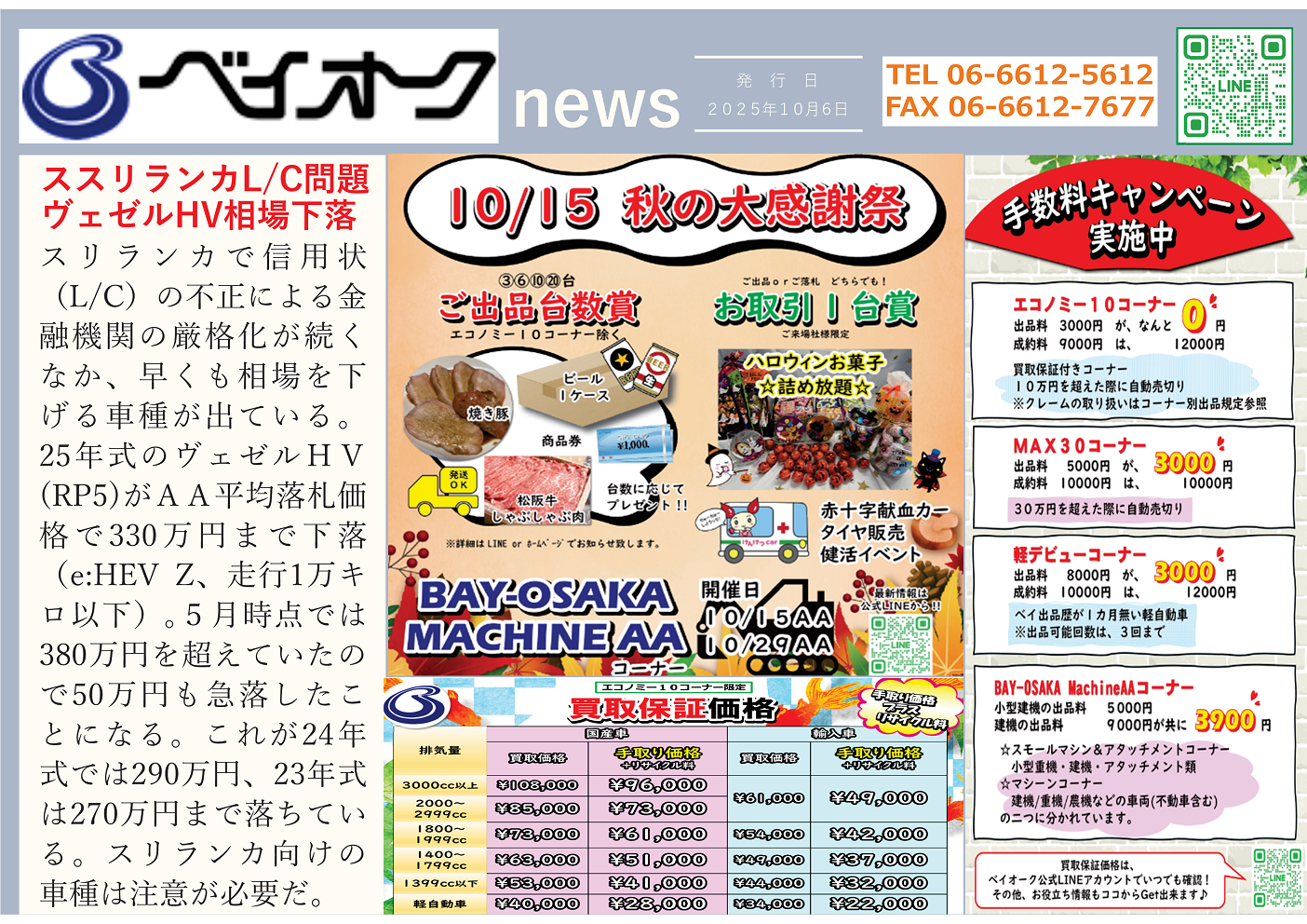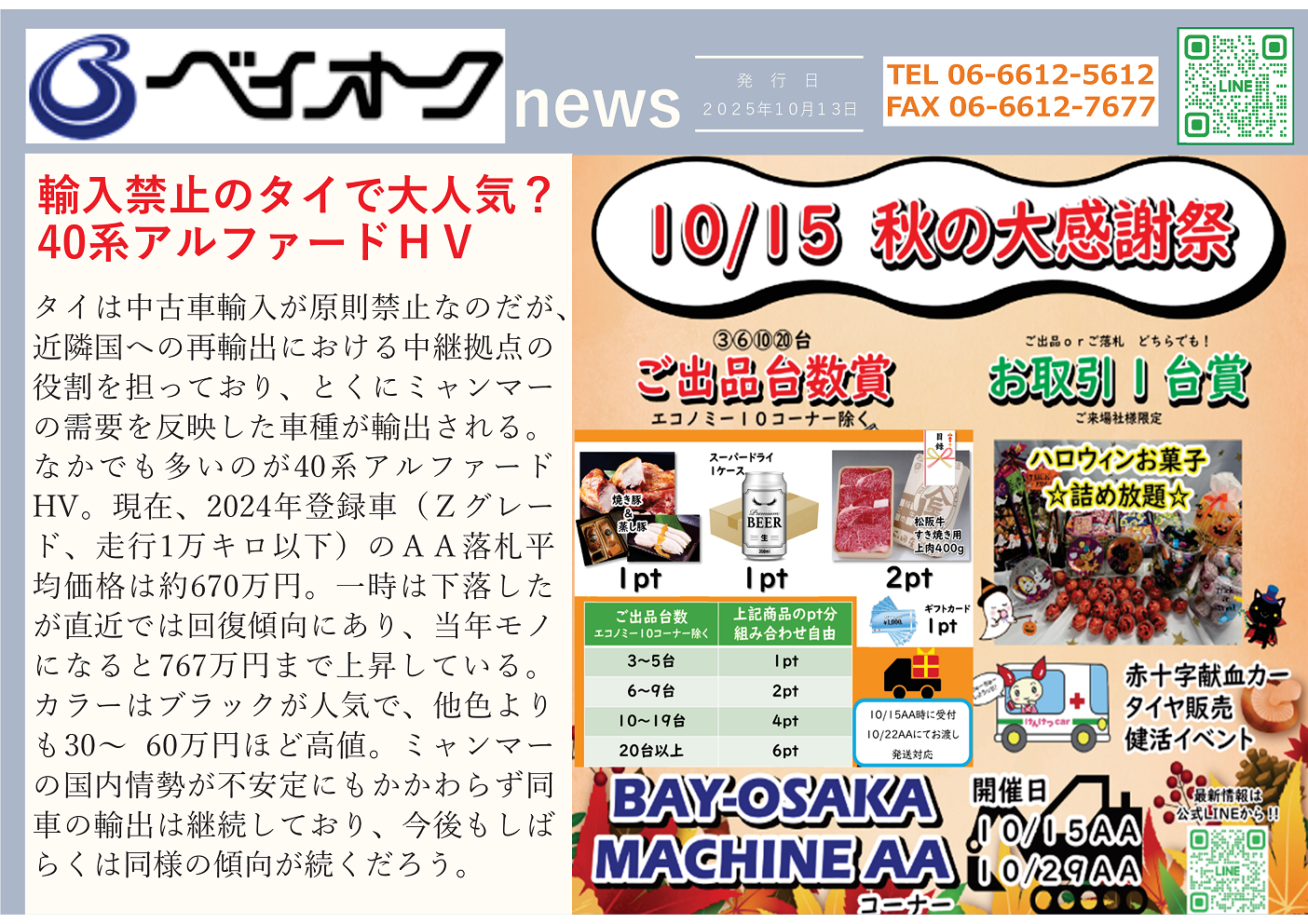 お知らせ 新着お知らせ 業界ニュース 2025.10.25 ベイオークnews 2025.10.21 ベイオークnews 2025.10.11 ベイオークnews 2025.10.6 ベイオークnews 2025.9.26 ベイオークnews 2025.9.23 10月イベントのご案内 2025.9.19 ベイオークnews 2025.9.15 ベイオークnews 2025.9.5 ベイオークnews 2025.9.1 ベイオークnews 2025.8.25 ベイオークnews 2025.8.18 ベイオークnews 2025.8.1 ベイオークnews 2025.7.30 後見・下見サービス開始のお知らせ 2025.7.28 【重要】電話・FAX番号変更のお知らせ 2025.7.28 ベイオークnews 2025.7.22 ベイオークnews 2025.7.17 夏季休暇のご案内 2025.7.16 7月16日AAよりBAY-OSAKA MACHINE AUCTION開始!! 2025.7.15 8月イベントのご案内 2025.7.14 ベイオークnews 2025.7.7 ベイオークnews 2025.6.30 ベイオークnews 2025.6.20 ベイオークnews 2025.6.16 ベイオークnews 2025.6.9 ベイオークnews 2025.6.4 骨格名称変更・商談方法変更及び規約改定のご案内 2025.6.2 ベイオークnews 2025.5.26 ベイオークnews 2025.5.20 ベイオークnews 2025.5.12 ベイオークnews 2025.4.25 ベイオークnews 2025.4.21 ベイオークnews 2025.4.15 ベイオークnews 2025.4.15 ゴールデンウィーク休暇のご案内 2025.4.15 4月・5月イベントのご案内 2025.4.9 4月16日オートウェイタイヤチラシ 2025.4.9 4月9日ベイ食堂オープン 2025.4.8 ベイオークnews 2025.4.1 落札手数料・商談手数料改定のお知らせ 2025.4.1 4月16日大記念AAイベントのご案内 2025.4.1 食堂リニューアルに伴うお知らせ 2025.3.31 ベイオークnews 2025.3.24 ベイオークnews 2025.3.18 ベイオークnews 2025.3.11 オークション規約一部改定のお知らせ 2025.3.11 外部ヤード搬出時間変更のご案内 2025.3.10 ベイオークnews 2025.3.3 3月自動車税の取り扱いについてのご案内 2025.3.3 ベイオークnews 2025.2.25 ベイオークnews 2025.2.17 ベイオークnews 2025.2.10 ベイオークnews 2025.2.3 ベイオークnews 2025.1.27 ベイオークnews 2025.1.20 ベイオークnews 2025.1.13 ベイオークnews 2025.1.6 ベイオークnews 2025.1.6 オークション規約一部改定・コーナー変更のお知らせ 2025.1.6 1月8日AA~セリ順、手数料のご案内 2024.12.23 ベイオークnews 2024.12.16 ベイオークnews 2024.12.9 ベイオークnews 2024.12.2 ベイオークnews 2024.11.25 ベイオークnews 2024.11.18 ベイオークnews 2024.11.11 ベイオークnews 2024.10.28 ベイオークnews 2024.10.23 ベイオークnews 2024.10.14 ベイオークnews 2024.10.7 ベイオークnews 2024.10.2 10月2日AAから出品コーナー条件変更のご案内 2024.10.1 東ヤード2開門時間変更のご案内 2024.10.1 ベイオークnews 2024.9.21 ベイオークnews 2024.9.16 ベイオークnews 2024.9.10 ベイオークnews 2024.9.3 ベイオークnews 2024.8.26 ベイオークnews 2024.8.15 ベイオークnews 2024.8.5 ベイオークnews 2024.7.30 ベイオークnews 2024.7.23 ベイオークnews 2024.7.16 ベイオークnews 2024.7.8 ベイオークnews 2024.7.1 ベイオークnews 2024.6.18 ベイオークnews 2024.6.7 ベイオークnews 2024.6.5 ベイオークnews 2024.5.28 ベイオークnews 2024.5.20 ベイオークnews 2024.5.13 ベイオークnews 2024.4.26 ベイオークnews 2024.4.22 ベイオークnews 2024.4.9 GW休暇のご案内 2024.4.8 ベイオークnews 2024.4.1 ベイオークnews 2024.4.1 ベイオークnews 2024.3.18 ベイオークnews 2024.3.15 搬出時間変更のご案内 2024.3.11 ベイオークnews 2024.3.5 ベイオークnews 2024.2.27 2月21日AA結果報告及び次週の予定 2024.2.16 2月14日AA結果報告及び次週の予定 2024.2.12 2月7日AA結果報告及び次週の予定 2024.1.15 1月10日AA結果報告及び次週の予定 オフィスや自宅からインターネット回線を通じてセリに参加できるのがベイネットです。 下見検索や不在入札機能、自社出品車輌の確認など豊富で使いやすい機能がいっぱいです。